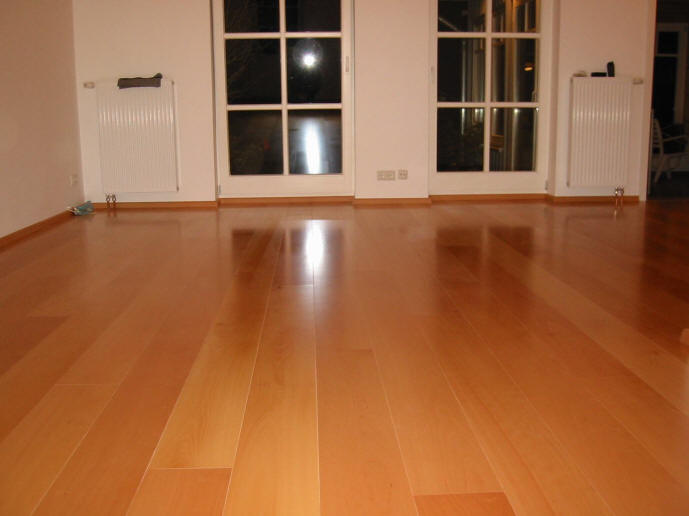 Buche Landhausdiele 3-Schicht mit leichter Fase lackiert und schwimmend verlegt, Bekleidungen immer sauber unterschnitten
